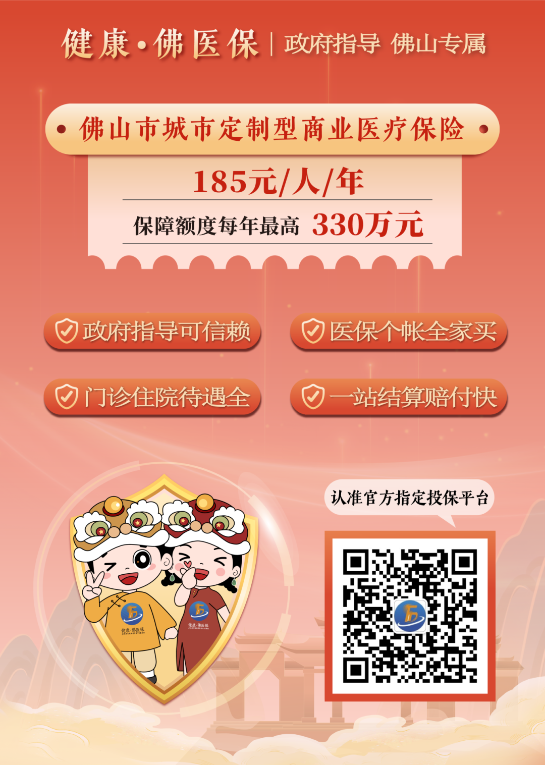 2024年度“健康·佛医保”是经佛山市人民政府同意,由佛山市医疗保障局、国家金融监督管理总局佛山监管分局、佛山市金融工作局和佛山市社会保险基金管理局共同指导,由中国人寿、人保财险、太平洋财险、平安财险、中华联合财险和太平财险联合承保的佛山市城市定制型商业医疗保险。