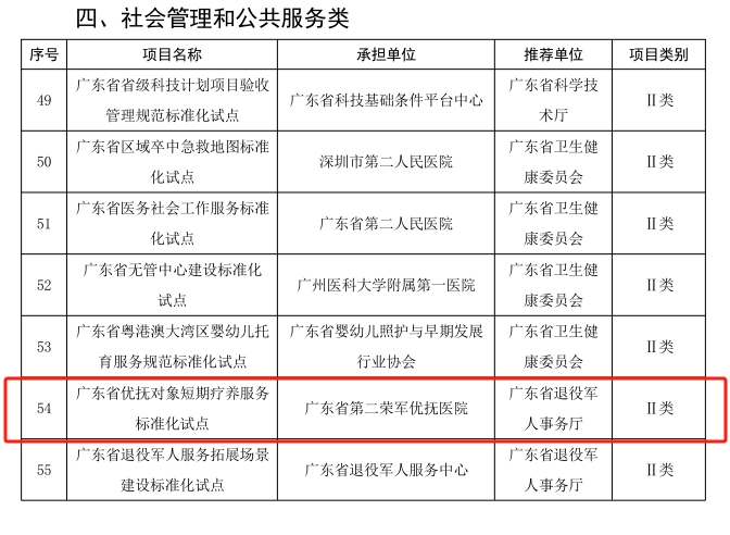 近日,广东省2026年省级标准化试点项目立项名单正式公布,我院凭借在优抚对象短期疗养服务领域的扎实积淀与创新实践,成功入选承担单位。此次全省共74个项目获批立项,其中省直单位仅14家,我院的成功入选不仅彰显了在该领域的领先优势,更标志着广东省优抚对象短期疗养服务标准化建设迈上新的发展台阶。