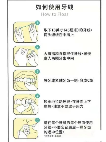 1. 入缝:将牙线对准牙间隙,左右轻柔移动,慢慢滑入牙缝。