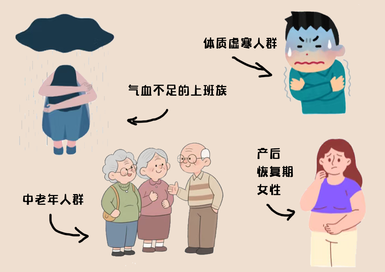 1.体质虚寒人群:平时畏寒怕冷、手脚冰凉,冬季更甚;面色苍白或萎黄,容易疲劳、气短乏力;大便稀溏、小便清长,舌苔薄白。