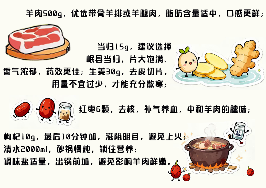 从中医角度看,羊肉性温味甘,归脾、肾经,能温中暖肾、益气补虚,是冬季补阳的“天然食材”;当归性温味甘辛,归肝、心、脾经,既能补血活血,又能缓解血虚引起的畏寒、乏力;生姜性温味辛,能温中散寒、去腥调味,三者搭配“温而不燥、补而不滞”,恰好对应冬季“寒邪易侵、阳气易耗”的特点,能从根源上驱散寒气、补足气血。
