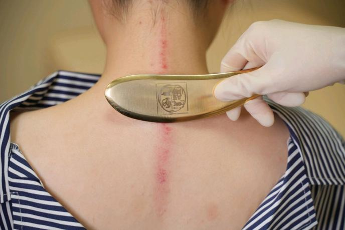 原理:刮痧是以中医经络腧穴理论为指导,通过特制的刮痧器具和相应的手法,借助油性介质在体表进行反复刮动、摩擦,使皮肤局部出现红色粟粒状,或暗红色出血点等“出痧”变化,从而达到活血透痧的作用。