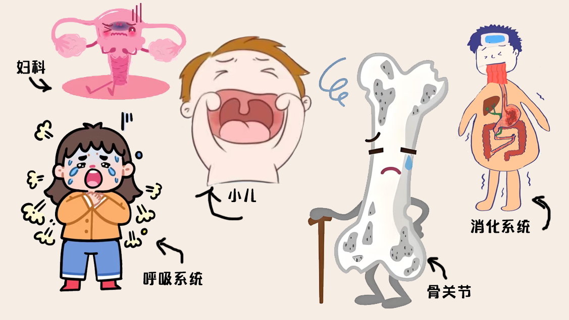 4.妇科疾病:月经不调、痛经、宫寒、慢性盆腔炎等寒证者。