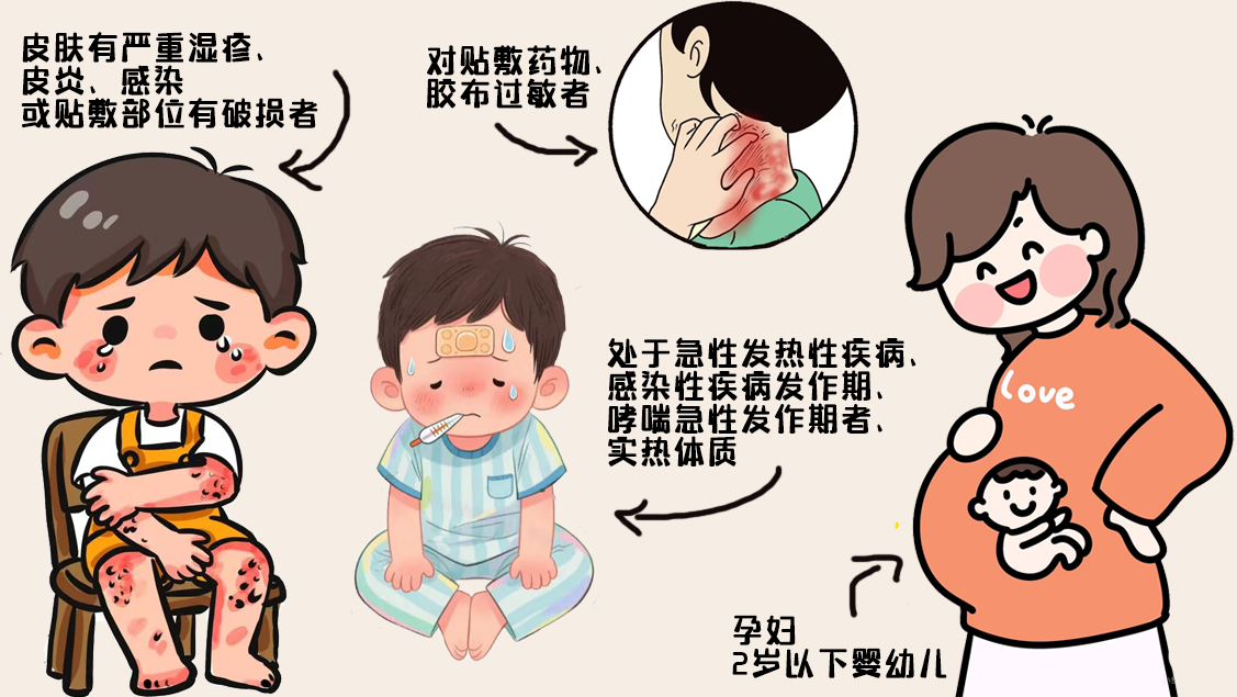 不适于孕妇、2岁以下婴幼儿;皮肤有严重湿疹、皮炎、感染或贴敷部位有破损者;处于急性发热性疾病、感染性疾病发作期、哮喘急性发作期者、实热体质;对贴敷药物、胶布过敏者。