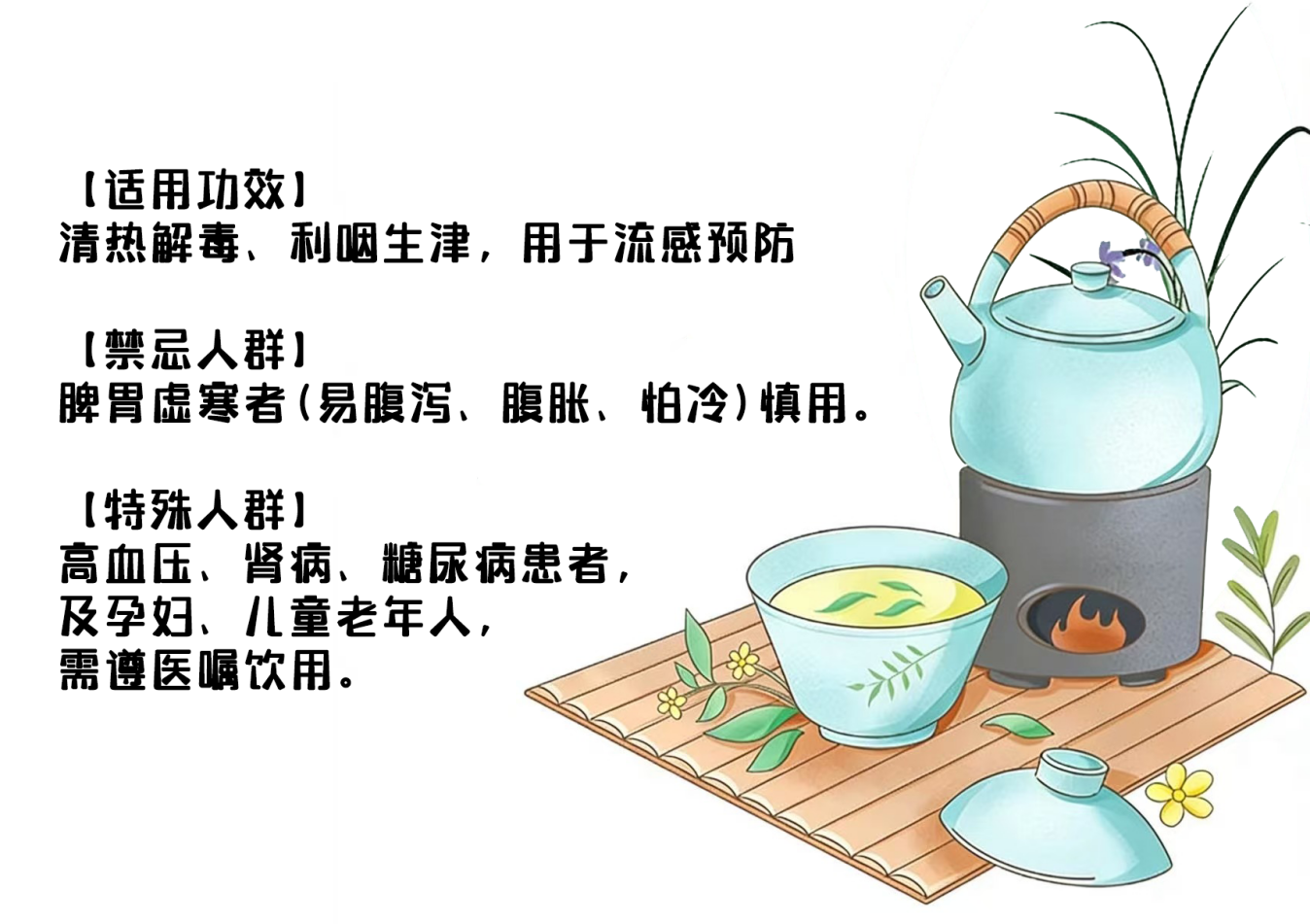 注意事项:此茶饮为预防性调理饮品,不能替代药物治疗。如出现发热(体温≥39℃)、全身酸痛、乏力加重等流感样症状,请及时就医,早诊早治。