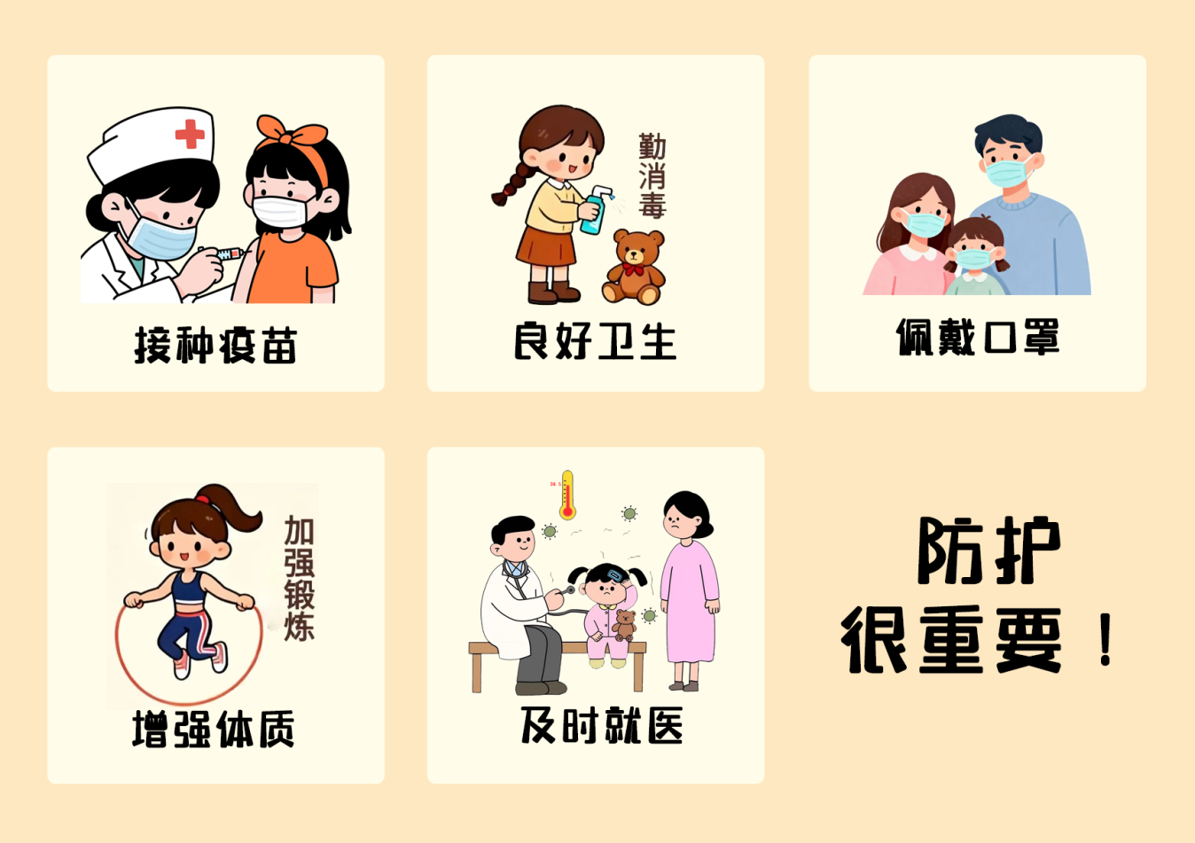 5.及时就医:如出现发热、咳嗽、咽痛、全身酸痛等流感样症状,请戴好口罩及时就诊,并避免带病工作或上学。