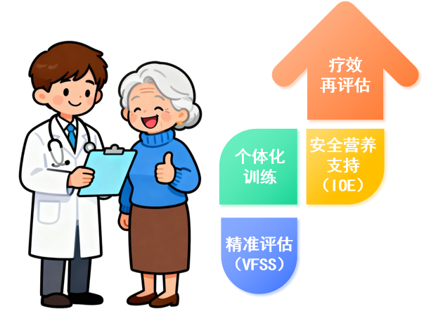 针对各种原因导致的吞咽障碍,尤其是脑卒中、脑外伤后需要中长期管饲营养,且有意愿和潜力恢复经口进食的患者,我院精心研制,构建了“精准评估-强化训练-安全营养支持”的一体化康复闭环: