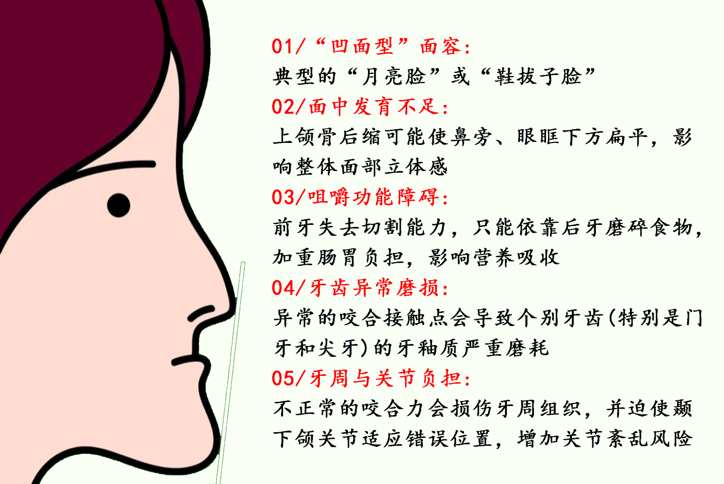除了影响面型发育,如限制上颌骨的正常向前发育,让下颌过度生长,异常的“地包天”咬合关系还会导致口腔功能与健康受损。