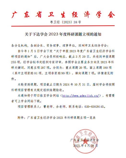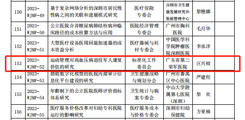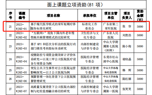 在五一劳动节来临之际,我院课题研究工作再创佳绩。广东省卫生经济学会公布的 2023 年度科研课题立项名单中,我院主持的2项课题成功立项,这是我院首次在省级成功立项的课题。其中,院长张容主持的《基于现代医学模式的荣军短期疗养服务标准化研究》获面上课题立项资助,神经康复科主任区兴棉主持的《运动管理对高血压病退役军人康复价值的研究》获面上课题立项非资助。